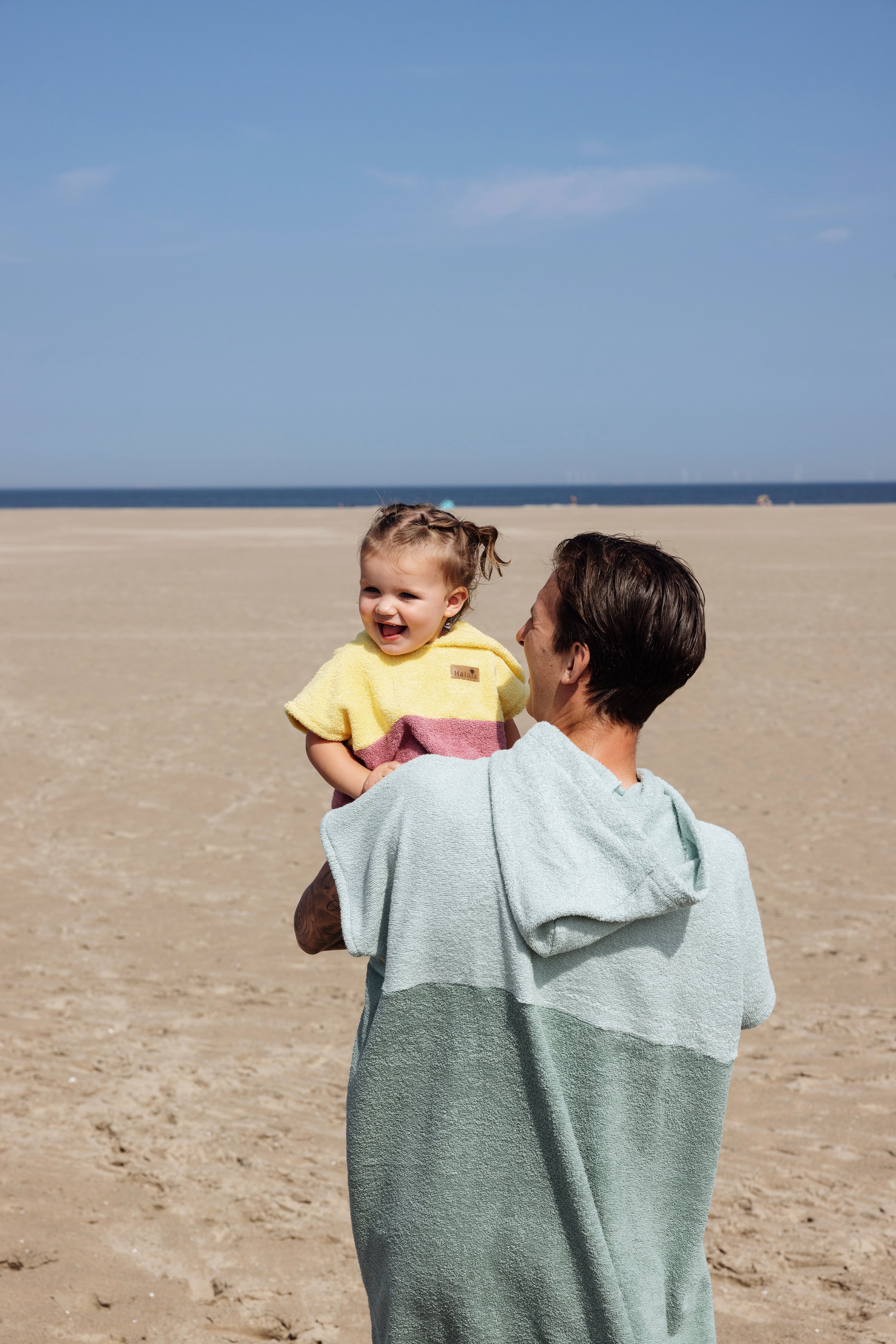De Poncho Moana – Baby is handgemaakt en uitgevoerd in een fleurige kleurencombinatie van geel boven en oudgroen onder. De kleuren zijn geïnspireerd op zonnestralen en tropische bloemen – vrolijk, zacht en lief. Perfect voor kleine zonnestraaltjes.
